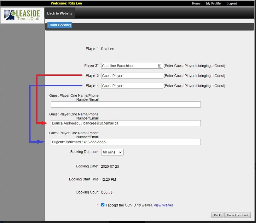 - e) Rita then enters each guest’s name, along with their email address or phone number into the corresponding fields below. In our example, Bianca’s (Player 3’s) information must go into the middle field and Eugenie’s (Player 4’s) must go in the bottom field